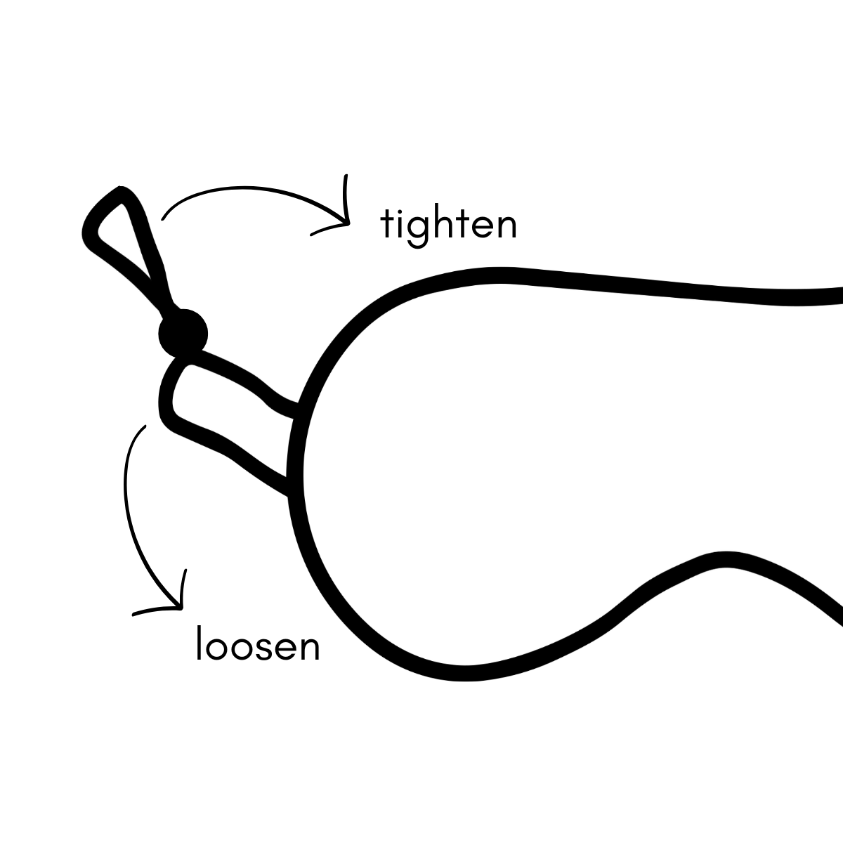Find the bottom of the elastic strap on the inside of the bead (between the bead and the mask). Pull this strap to loosen the mask if it feels too tight.
